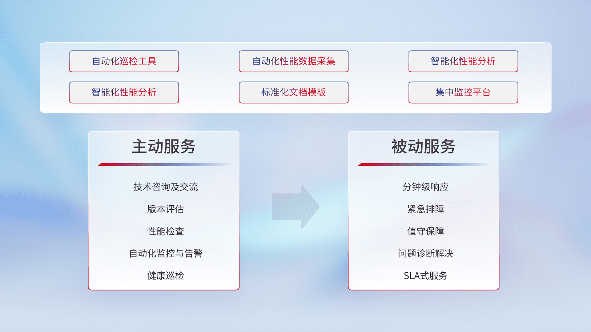 智能化工具和标准化文档,,,保障服务质量,,,提供主动服务(包含技术咨询、、、、版本评估、、性能检查、、、、自动化监控与告警、、健康巡检)和被动服务包含(分钟级响应、、、紧急排障、、、、值守保障、、、、问题诊断解决、、SLA服务)。。